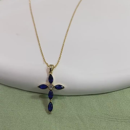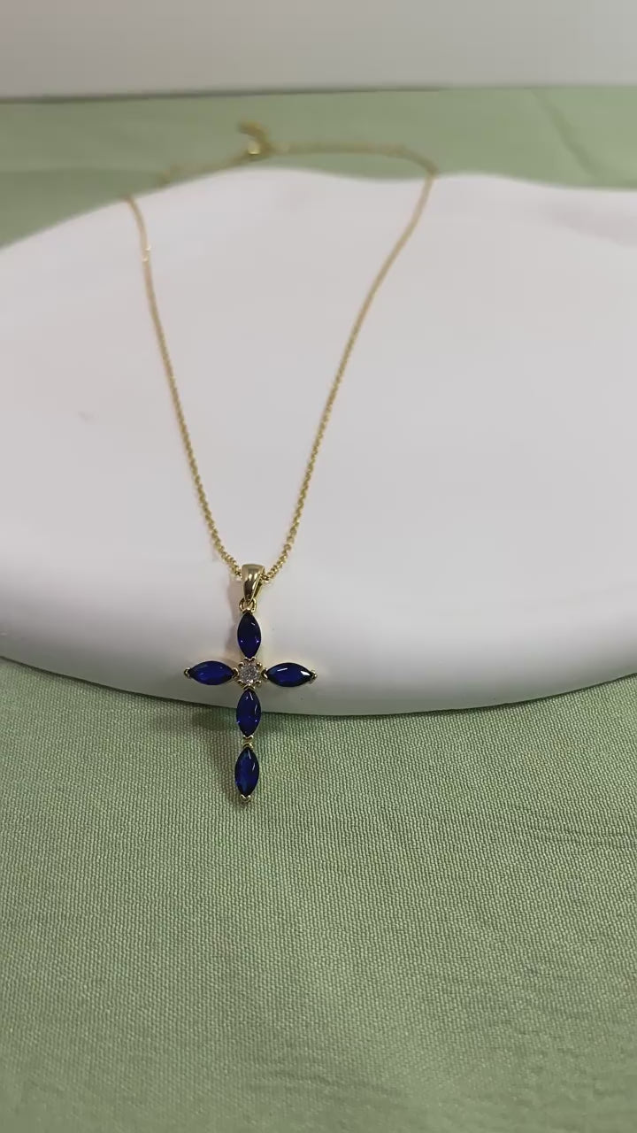 The blue zirconia cross necklace, a striking accessory featuring aradiant blue zirconia stones set in a sleek cross design, blending spiritual symbolism with elegant glamour.